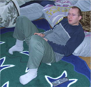 Patrick wie so oft hoch konzentriert vor dem Fernseher mit dem PS2-Controller in der Hand.