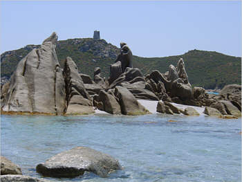 Felsen bizarr mit Sarazenenturm - bei Villasimius.
